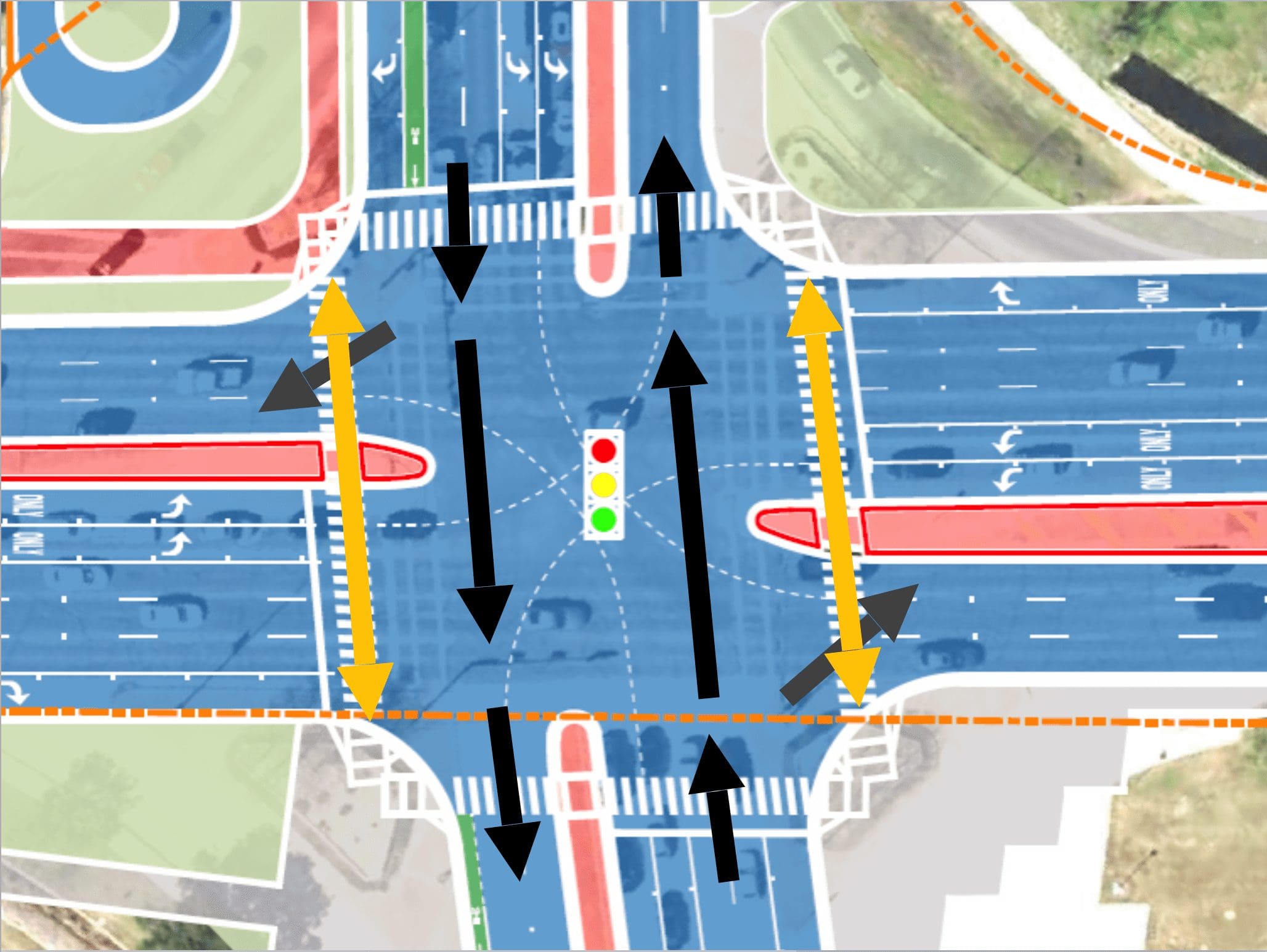 Figure 3 shows the usual signal operation at an intersection where pedestrians (the yellow arrows) cross with parallel vehicular movement (the black arrows). Notice the conflict points where the yellow and black arrows cross? That is the point where the vehicular traffic must yield to the pedestrians, which slows down traffic and leads walkers to worry about drivers yielding.