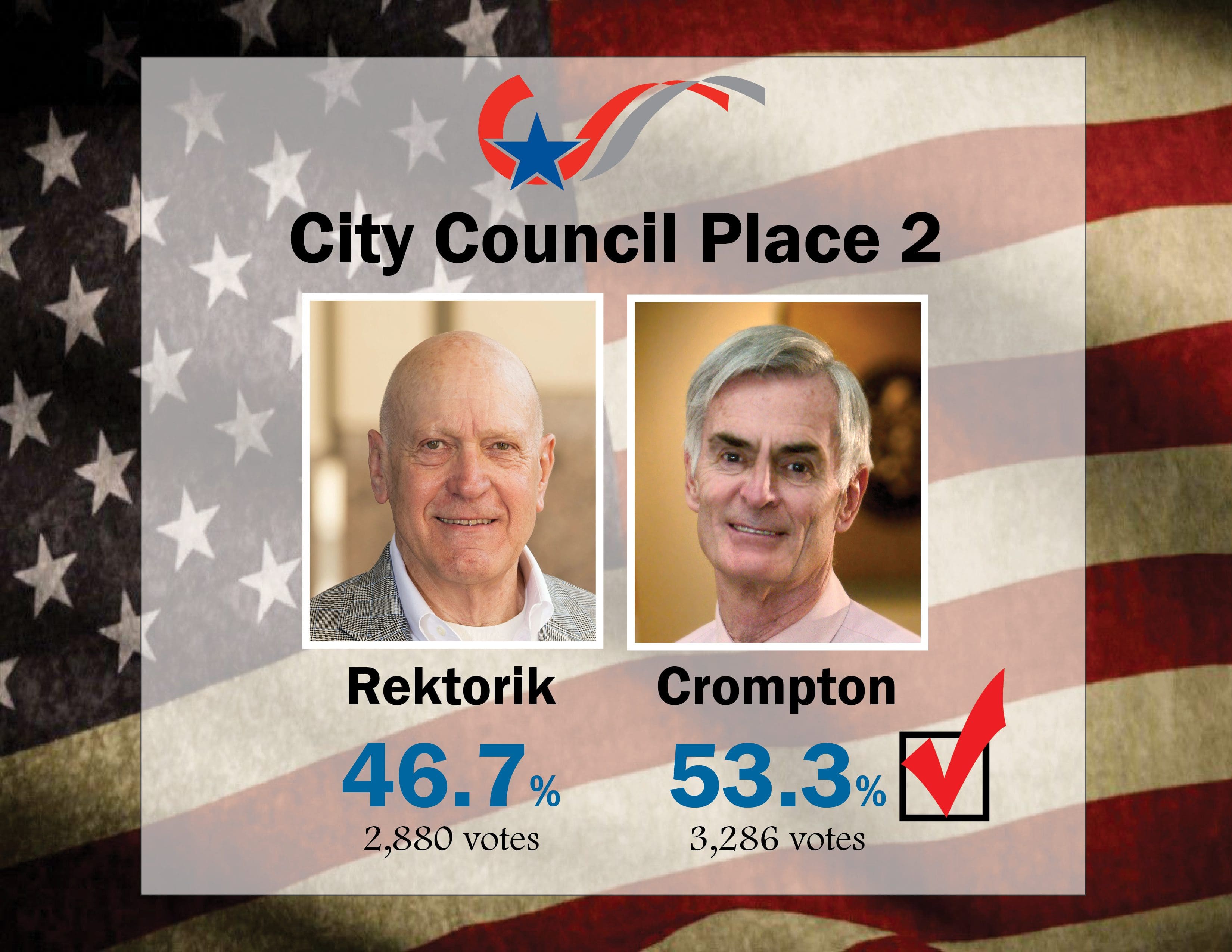 Although the totals don’t include provisional, military and late mail-in ballots, those numbers are not sufficient to affect the outcome. The vote will be officially canvassed and Crompton will be sworn into office at the Nov. 14 city council meeting.