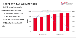 Property valuations are determined by the Brazos Central Appraisal District on Jan. 1 and don’t reflect the economic impact of the stay-at-home orders and the COVID-19 pandemic. The total preliminary net taxable certified value of College Station property for 2020 is about $10.1Â billion, an increase of over 2.05% from 2019. However, the estimated property value under protest is almost $1.1 billion. Final property values will be available near the end of July.