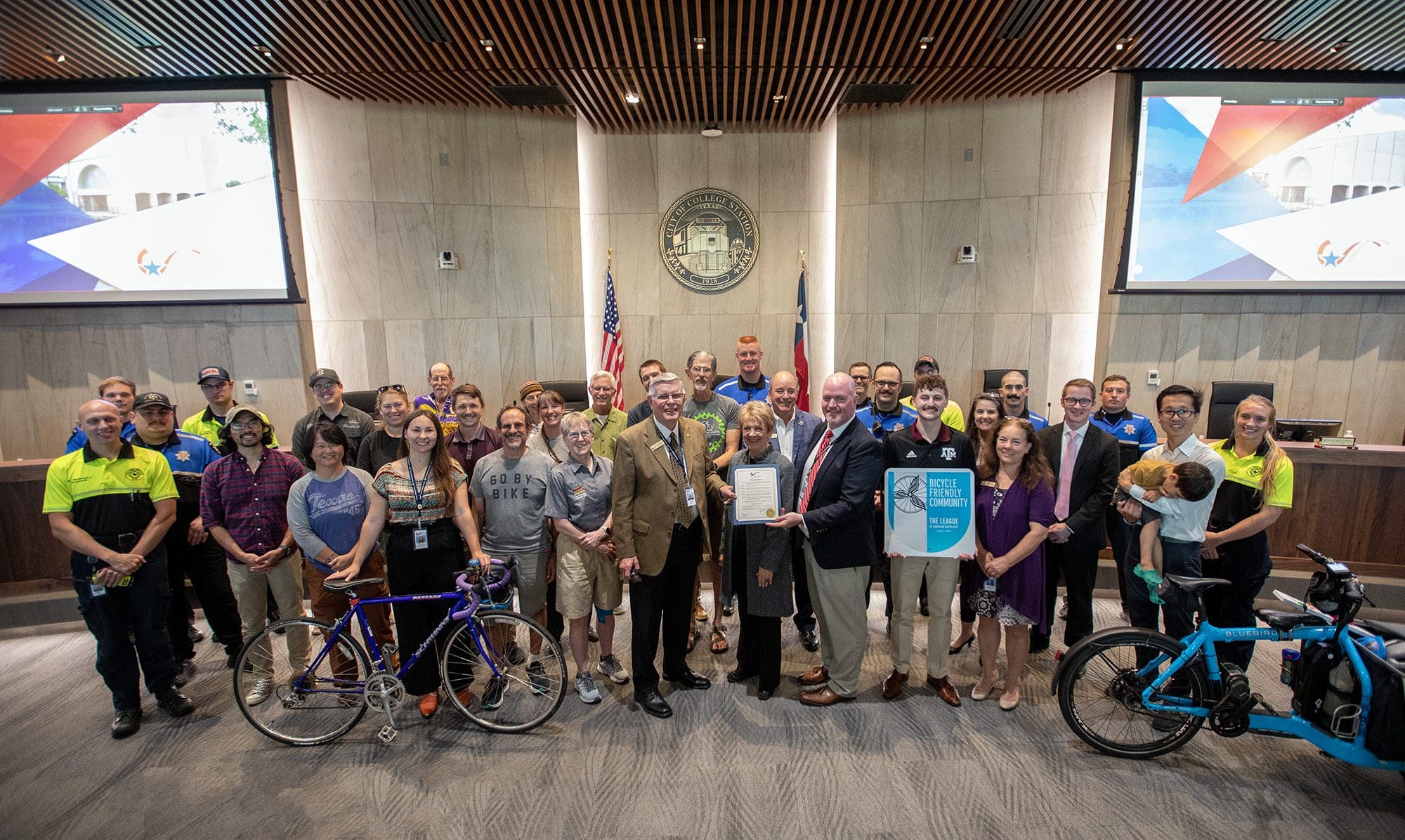 Mayor John Nichols proclaimed May as National Bike Month to showcase the benefits of bicycling and encourage people to try it. City council members are pictured below with members of the Bicycle, Pedestrian, and Greenways Committee and community biking groups.