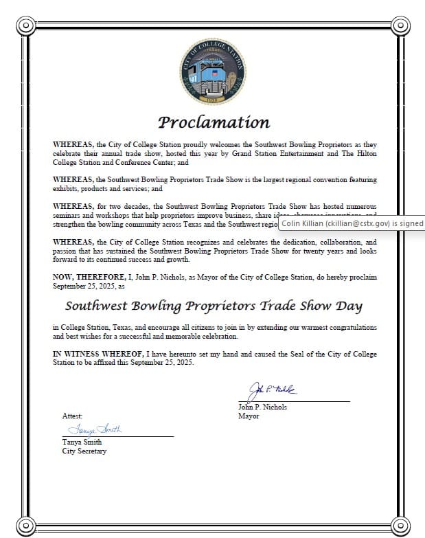 Mayor Nichols proclaimed Thursday as Southwest Bowling Proprietors Trade Show Day to celebrate the dedication, collaboration, and passion that have sustained the event for two decades.
