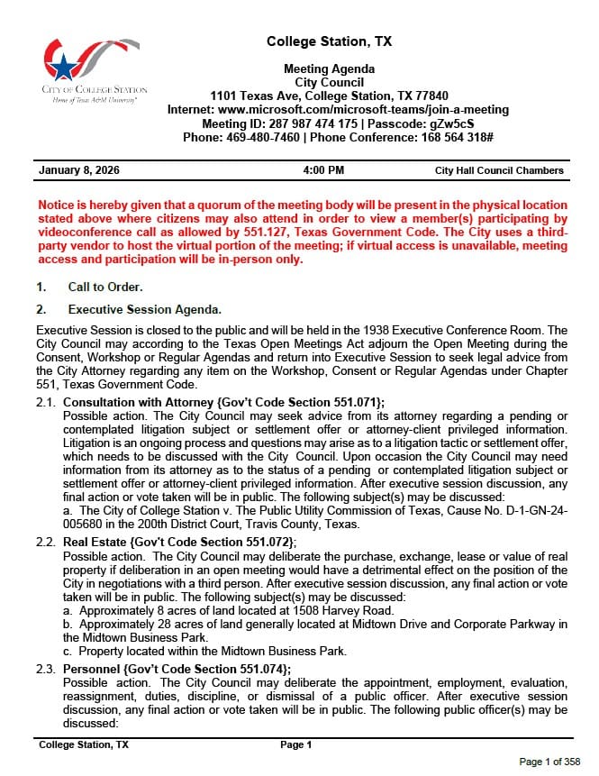 The College Station City Council meets on Thursday after 6 p.m. at City Hall. The meeting will be streamed live on Optimum Channel 19 and at cstx.gov/cstv19.
