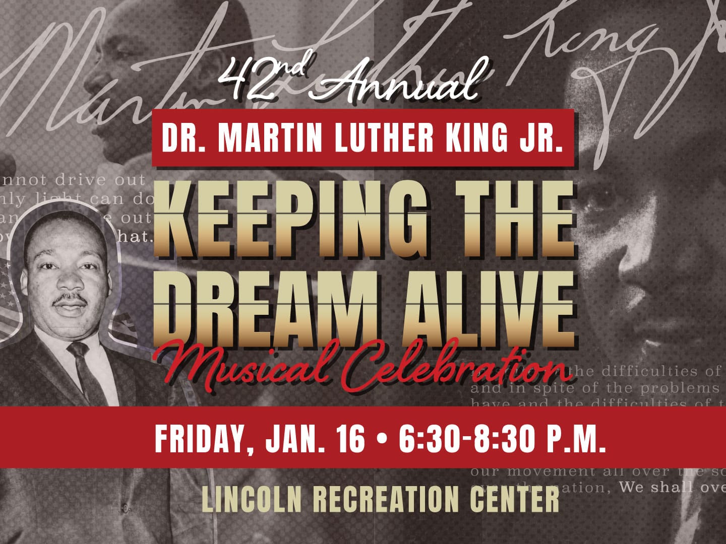 The College Station Parks and Recreation Department invites you to celebrate Dr. King’s legacy through music, dance, and community spirit at the 42nd Annual Keeping the Dream Alive Musical Celebration at the Lincoln Recreation Center on Friday from 6:30-8:30 p.m.